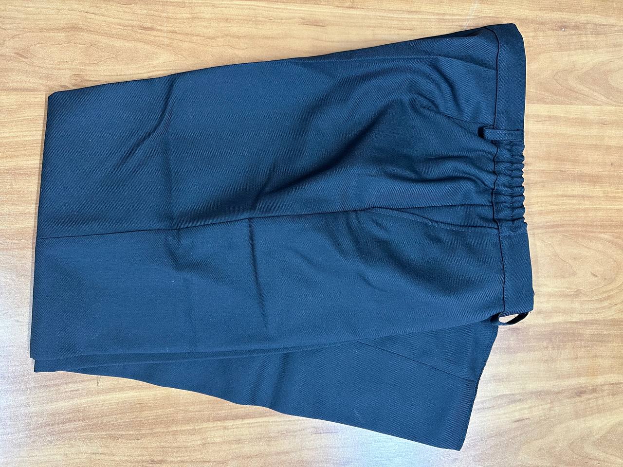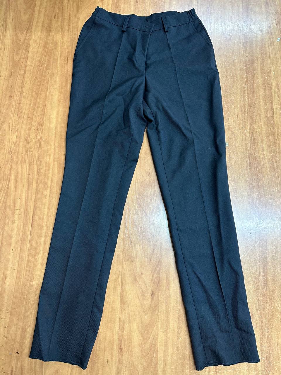 Брюки форменные полушерстяные черного цвета. Прямого покроя с притачным поясом . Передние половинки брюк – с боковыми карманами. По входу в боковой карман проложена отделочная строчка 0.5мм. по шлевкам две отделочные строчки. Пояс в области боковых швов стянут эластичными лентами и имеет впереди и сзади по две шлевки для ремня. Брюки с застежкой на левую сторону. На неразъёмную молнию, петлю и пуговицу на поясе. Ткань для верха – полушерстяная камвольная костюмная содержание шерсти 55%, П/Э 45%. Цвет фурнитуры и ниток в цвет ткани. Ткань прокладочная для прокладки в гульфик, откосок, левую и правую части пояса, для долевиков боковых карманов, с регулярным точечным покрытием. Цвет – черный. Подкладка 50% поливискоза, 50% ПЭ.