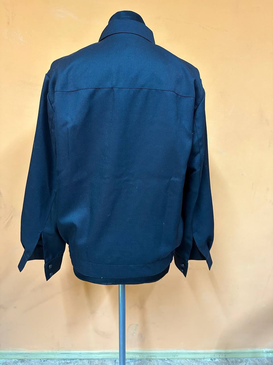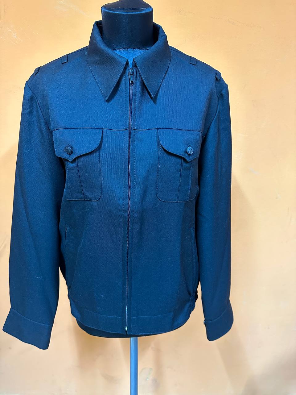 Куртка полушерстяная камвольная костюмная черного (цвет по согласованию) с центральной бортовой застежкой состоит из полочек, спинки, воротника и рукавов. Полочки с застежкой на молнии, с кокетками, верхними накладными карманами с двумя вертикальными складками и клапанами, застегивающимися на форменные пуговицы, и боковыми долевыми прорезными карманами, застегивающимися на молнию. Спинка с кокеткой. Куртка с поясом, в области боковых швов стянутым эластичными лентами. Воротник отложной. Рукава втачные с манжетами, застегивающимися на 2 форменные пуговицы. В области плечевых швов — шлевки и петли для крепления погон. Полочки и спинка куртки на подкладке чёрного цвета. Ткань верха – 55% шерсть, 45% ПЭ. Подкладка-ткань подкладочная. Форменные пуговицы чёрного цвета.