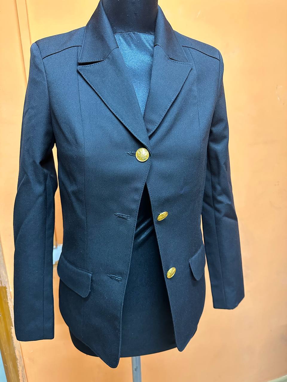 Жакет форменный полушерстяной 55% шерсть, 45% п/э, черного цвета, на подкладке с открытой центральной застежкой на три форменные пуговицы золотистого цвета диаметром 22 мм. Полочки с наклонными кокетками и рельефами из-под кокеток и до низа с наклонными прорезными карманами с клапанами. Спинка с кокеткой и рельефами из - под кокетки и до низа. Воротник отложной, пиджачного типа. Рукава втачные, двухшовные Жакет на подкладке до низа, с внутренним карманом. Подкладка 50% поливискоза, 50% ПЭ. Жакет — верхняя часть повседневной, парадной и полевой формы одежды, выполняемой особым покроем, и носимой людьми, военнослужащими в вооруженных силах или служащими в правоохранительных органах, а также в учебных учреждениях. Комфортная кадетская форма. Жакет скрывает недостатки подчеркивает достоинства фигуры. Жакет одевают на торжественные встречи, парад, присягу и 1 сентября и тд. Шьется из полушерстяной ткани, на легкой гладкой подкладке.